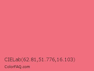 CIELab 62.81,51.776,16.103 Color is a light red color and the nearest color is Froly #f57584. Hex code #f16e7e and RGB value is rgb(241,110,126). In RGB color space, this color is composed of 95% red, 43% green, 49% blue, In CMYK color space, this color is composed of 0% cyan, 54% magenta, 48% yellow , 5% black , In HSL color space, this color has a hue angle of 353° , 82% saturation and 69% lightness.