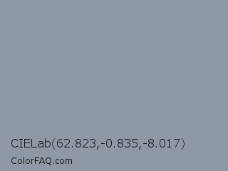 CIELab 62.823,-0.835,-8.017 Color is a light blue color and the nearest color is Manatee #979aaa. Hex code #8f99a6 and RGB value is rgb(143,153,166). In RGB color space, this color is composed of 56% red, 60% green, 65% blue, In CMYK color space, this color is composed of 14% cyan, 8% magenta, 0% yellow , 35% black , In HSL color space, this color has a hue angle of 214° , 11% saturation and 61% lightness.