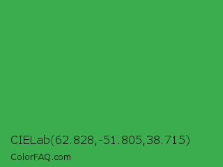 CIELab 62.828,-51.805,38.715 Color is a normal green color and the nearest color is Chateau Green #40a860. Hex code #3bad4f and RGB value is rgb(59,173,79). In RGB color space, this color is composed of 23% red, 68% green, 31% blue, In CMYK color space, this color is composed of 66% cyan, 0% magenta, 54% yellow , 32% black , In HSL color space, this color has a hue angle of 131° , 49% saturation and 45% lightness.