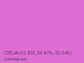 CIELab 62.831,56.879,-32.646 Color is a light magenta color and the nearest color is Orchid #da70d6. Hex code #de6ed3 and RGB value is rgb(222,110,211). In RGB color space, this color is composed of 87% red, 43% green, 83% blue, In CMYK color space, this color is composed of 0% cyan, 50% magenta, 5% yellow , 13% black , In HSL color space, this color has a hue angle of 306° , 63% saturation and 65% lightness.