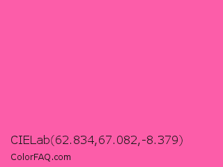 CIELab 62.834,67.082,-8.379 Color is a light rose color and the nearest color is Brilliant Rose #ff55a3. Hex code #fc5da9 and RGB value is rgb(252,93,169). In RGB color space, this color is composed of 99% red, 36% green, 66% blue, In CMYK color space, this color is composed of 0% cyan, 63% magenta, 33% yellow , 1% black , In HSL color space, this color has a hue angle of 331° , 96% saturation and 68% lightness.