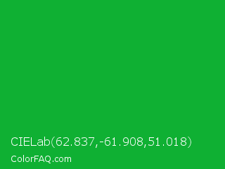 CIELab 62.837,-61.908,51.018 Color is a normal green color and the nearest color is Dark Pastel Green #03c03c. Hex code #0fb033 and RGB value is rgb(15,176,51). In RGB color space, this color is composed of 6% red, 69% green, 20% blue, In CMYK color space, this color is composed of 91% cyan, 0% magenta, 71% yellow , 31% black , In HSL color space, this color has a hue angle of 133° , 84% saturation and 37% lightness.