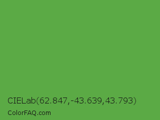CIELab 62.847,-43.639,43.793 Color is a normal green color and the nearest color is Apple #4fa83d. Hex code #5baa45 and RGB value is rgb(91,170,69). In RGB color space, this color is composed of 36% red, 67% green, 27% blue, In CMYK color space, this color is composed of 46% cyan, 0% magenta, 59% yellow , 33% black , In HSL color space, this color has a hue angle of 107° , 42% saturation and 47% lightness.