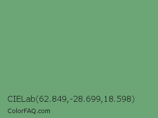 CIELab 62.849,-28.699,18.598 Color is a normal green color and the nearest color is Aqua Forest #5fa777. Hex code #6ca576 and RGB value is rgb(108,165,118). In RGB color space, this color is composed of 42% red, 65% green, 46% blue, In CMYK color space, this color is composed of 35% cyan, 0% magenta, 28% yellow , 35% black , In HSL color space, this color has a hue angle of 131° , 24% saturation and 54% lightness.