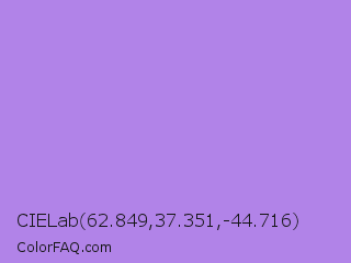 CIELab 62.849,37.351,-44.716 Color is a light violet color and the nearest color is Lavender #b57edc. Hex code #b183e8 and RGB value is rgb(177,131,232). In RGB color space, this color is composed of 69% red, 51% green, 91% blue, In CMYK color space, this color is composed of 24% cyan, 44% magenta, 0% yellow , 9% black , In HSL color space, this color has a hue angle of 267° , 69% saturation and 71% lightness.