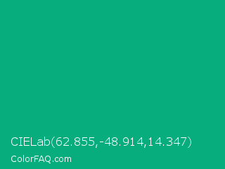 CIELab 62.855,-48.914,14.347 Color is a normal green color and the nearest color is Green Munsell #00a877. Hex code #07ad7d and RGB value is rgb(7,173,125). In RGB color space, this color is composed of 3% red, 68% green, 49% blue, In CMYK color space, this color is composed of 96% cyan, 0% magenta, 28% yellow , 32% black , In HSL color space, this color has a hue angle of 163° , 92% saturation and 35% lightness.