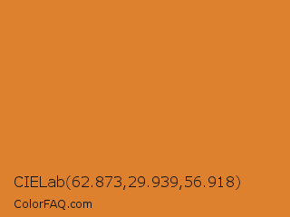 CIELab 62.873,29.939,56.918 Color is a normal orange color and the nearest color is Cadmium Orange #ed872d. Hex code #de812f and RGB value is rgb(222,129,47). In RGB color space, this color is composed of 87% red, 51% green, 18% blue, In CMYK color space, this color is composed of 0% cyan, 42% magenta, 79% yellow , 13% black , In HSL color space, this color has a hue angle of 28° , 73% saturation and 53% lightness.