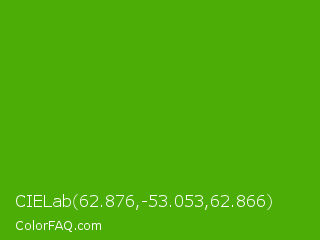 CIELab 62.876,-53.053,62.866 Color is a normal green color and the nearest color is Kelly Green #4cbb17. Hex code #4cad07 and RGB value is rgb(76,173,7). In RGB color space, this color is composed of 30% red, 68% green, 3% blue, In CMYK color space, this color is composed of 56% cyan, 0% magenta, 96% yellow , 32% black , In HSL color space, this color has a hue angle of 95° , 92% saturation and 35% lightness.
