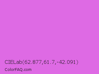 CIELab 62.877,61.7,-42.091 Color is a light magenta color and the nearest color is Orchid #da70d6. Hex code #de6ae4 and RGB value is rgb(222,106,228). In RGB color space, this color is composed of 87% red, 42% green, 89% blue, In CMYK color space, this color is composed of 3% cyan, 54% magenta, 0% yellow , 11% black , In HSL color space, this color has a hue angle of 297° , 69% saturation and 65% lightness.