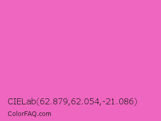 CIELab 62.879,62.054,-21.086 Color is a light magenta color and the nearest color is Hot Pink #ff69b4. Hex code #ee66bf and RGB value is rgb(238,102,191). In RGB color space, this color is composed of 93% red, 40% green, 75% blue, In CMYK color space, this color is composed of 0% cyan, 57% magenta, 20% yellow , 7% black , In HSL color space, this color has a hue angle of 321° , 80% saturation and 67% lightness.