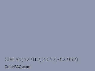 CIELab 62.912,2.057,-12.952 Color is a light blue color and the nearest color is Cool Grey #8c92ac. Hex code #9098af and RGB value is rgb(144,152,175). In RGB color space, this color is composed of 56% red, 60% green, 69% blue, In CMYK color space, this color is composed of 18% cyan, 13% magenta, 0% yellow , 31% black , In HSL color space, this color has a hue angle of 225° , 16% saturation and 63% lightness.