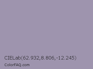 CIELab 62.932,8.806,-12.245 Color is a light violet color and the nearest color is Amethyst Smoke #a397b4. Hex code #9e94ae and RGB value is rgb(158,148,174). In RGB color space, this color is composed of 62% red, 58% green, 68% blue, In CMYK color space, this color is composed of 9% cyan, 15% magenta, 0% yellow , 32% black , In HSL color space, this color has a hue angle of 263° , 14% saturation and 63% lightness.