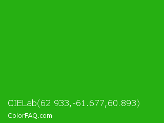 CIELab 62.933,-61.677,60.893 Color is a normal green color and the nearest color is Slimy Green #299617. Hex code #26b012 and RGB value is rgb(38,176,18). In RGB color space, this color is composed of 15% red, 69% green, 7% blue, In CMYK color space, this color is composed of 78% cyan, 0% magenta, 90% yellow , 31% black , In HSL color space, this color has a hue angle of 112° , 81% saturation and 38% lightness.