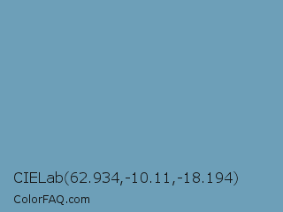 CIELab 62.934,-10.11,-18.194 Color is a normal blue color and the nearest color is Air Superiority Blue #72a0c1. Hex code #6d9fb8 and RGB value is rgb(109,159,184). In RGB color space, this color is composed of 43% red, 62% green, 72% blue, In CMYK color space, this color is composed of 41% cyan, 14% magenta, 0% yellow , 28% black , In HSL color space, this color has a hue angle of 200° , 35% saturation and 57% lightness.