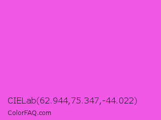 CIELab 62.944,75.347,-44.022 Color is a light magenta color and the nearest color is Purple Pizzazz #fe4eda. Hex code #f257e8 and RGB value is rgb(242,87,232). In RGB color space, this color is composed of 95% red, 34% green, 91% blue, In CMYK color space, this color is composed of 0% cyan, 64% magenta, 4% yellow , 5% black , In HSL color space, this color has a hue angle of 304° , 86% saturation and 65% lightness.