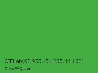 CIELab 62.955,-51.235,44.162 Color is a normal green color and the nearest color is Apple #4fa83d. Hex code #44ad44 and RGB value is rgb(68,173,68). In RGB color space, this color is composed of 27% red, 68% green, 27% blue, In CMYK color space, this color is composed of 61% cyan, 0% magenta, 61% yellow , 32% black , In HSL color space, this color has a hue angle of 120° , 44% saturation and 47% lightness.