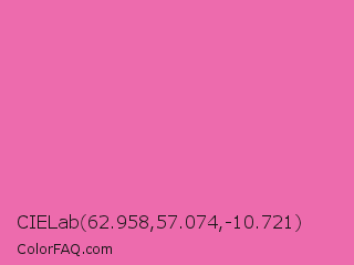 CIELab 62.958,57.074,-10.721 Color is a light rose color and the nearest color is Cyclamen #f56fa1. Hex code #ed6bad and RGB value is rgb(237,107,173). In RGB color space, this color is composed of 93% red, 42% green, 68% blue, In CMYK color space, this color is composed of 0% cyan, 55% magenta, 27% yellow , 7% black , In HSL color space, this color has a hue angle of 330° , 78% saturation and 67% lightness.