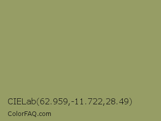 CIELab 62.959,-11.722,28.49 Color is a normal yellow color and the nearest color is Moss Green #8a9a5b. Hex code #969d65 and RGB value is rgb(150,157,101). In RGB color space, this color is composed of 59% red, 62% green, 40% blue, In CMYK color space, this color is composed of 4% cyan, 0% magenta, 36% yellow , 38% black , In HSL color space, this color has a hue angle of 68° , 22% saturation and 51% lightness.