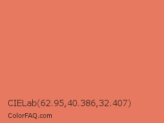 CIELab 62.95,40.386,32.407 Color is a light red color and the nearest color is Terracotta #e2725b. Hex code #e77961 and RGB value is rgb(231,121,97). In RGB color space, this color is composed of 91% red, 47% green, 38% blue, In CMYK color space, this color is composed of 0% cyan, 48% magenta, 58% yellow , 9% black , In HSL color space, this color has a hue angle of 11° , 74% saturation and 64% lightness.