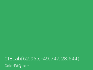 CIELab 62.965,-49.747,28.644 Color is a normal green color and the nearest color is Chateau Green #40a860. Hex code #35ad63 and RGB value is rgb(53,173,99). In RGB color space, this color is composed of 21% red, 68% green, 39% blue, In CMYK color space, this color is composed of 69% cyan, 0% magenta, 43% yellow , 32% black , In HSL color space, this color has a hue angle of 143° , 53% saturation and 44% lightness.