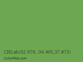 CIELab 62.979,-34.495,37.873 Color is a normal green color and the nearest color is Asparagus Green #7ba05b. Hex code #6ea752 and RGB value is rgb(110,167,82). In RGB color space, this color is composed of 43% red, 65% green, 32% blue, In CMYK color space, this color is composed of 34% cyan, 0% magenta, 51% yellow , 35% black , In HSL color space, this color has a hue angle of 100° , 34% saturation and 49% lightness.