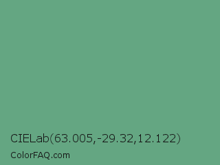 CIELab 63.005,-29.32,12.122 Color is a normal green color and the nearest color is Shiny Shamrock #5fa778. Hex code #64a682 and RGB value is rgb(100,166,130). In RGB color space, this color is composed of 39% red, 65% green, 51% blue, In CMYK color space, this color is composed of 40% cyan, 0% magenta, 22% yellow , 35% black , In HSL color space, this color has a hue angle of 147° , 27% saturation and 52% lightness.
