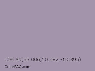 CIELab 63.006,10.482,-10.395 Color is a light purple color and the nearest color is Heliotrope Gray #aa98a9. Hex code #a393ab and RGB value is rgb(163,147,171). In RGB color space, this color is composed of 64% red, 58% green, 67% blue, In CMYK color space, this color is composed of 5% cyan, 14% magenta, 0% yellow , 33% black , In HSL color space, this color has a hue angle of 280° , 13% saturation and 62% lightness.
