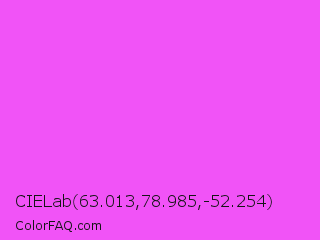 CIELab 63.013,78.985,-52.254 Color is a light magenta color and the nearest color is Pink Flamingo Crayola #ff66ff. Hex code #f153f7 and RGB value is rgb(241,83,247). In RGB color space, this color is composed of 95% red, 33% green, 97% blue, In CMYK color space, this color is composed of 2% cyan, 66% magenta, 0% yellow , 3% black , In HSL color space, this color has a hue angle of 298° , 91% saturation and 65% lightness.