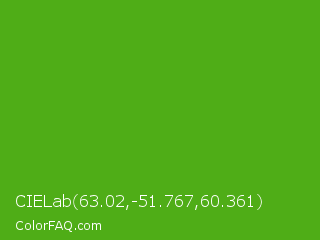CIELab 63.02,-51.767,60.361 Color is a normal green color and the nearest color is Kelly Green #4cbb17. Hex code #4fad17 and RGB value is rgb(79,173,23). In RGB color space, this color is composed of 31% red, 68% green, 9% blue, In CMYK color space, this color is composed of 54% cyan, 0% magenta, 87% yellow , 32% black , In HSL color space, this color has a hue angle of 98° , 77% saturation and 38% lightness.