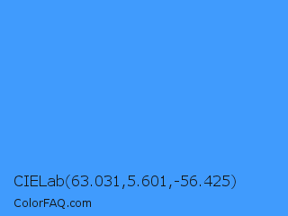 CIELab 63.031,5.601,-56.425 Color is a light blue color and the nearest color is Brilliant Azure #3399ff. Hex code #409bfd and RGB value is rgb(64,155,253). In RGB color space, this color is composed of 25% red, 61% green, 99% blue, In CMYK color space, this color is composed of 75% cyan, 39% magenta, 0% yellow , 1% black , In HSL color space, this color has a hue angle of 211° , 98% saturation and 62% lightness.