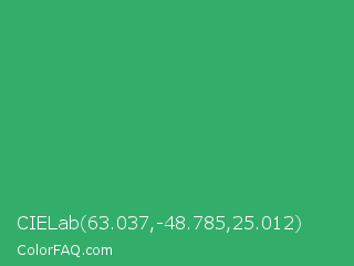 CIELab 63.037,-48.785,25.012 Color is a normal green color and the nearest color is Medium Sea Green #3cb371. Hex code #33ad6a and RGB value is rgb(51,173,106). In RGB color space, this color is composed of 20% red, 68% green, 42% blue, In CMYK color space, this color is composed of 71% cyan, 0% magenta, 39% yellow , 32% black , In HSL color space, this color has a hue angle of 147° , 54% saturation and 44% lightness.