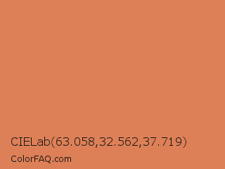 CIELab 63.058,32.562,37.719 Color is a light orange color and the nearest color is Raw Sienna #d68a59. Hex code #de8057 and RGB value is rgb(222,128,87). In RGB color space, this color is composed of 87% red, 50% green, 34% blue, In CMYK color space, this color is composed of 0% cyan, 42% magenta, 61% yellow , 13% black , In HSL color space, this color has a hue angle of 18° , 67% saturation and 61% lightness.