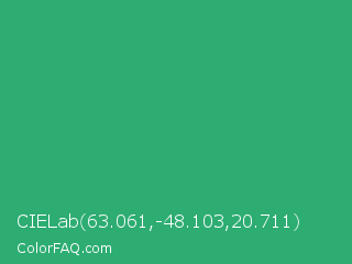 CIELab 63.061,-48.103,20.711 Color is a normal green color and the nearest color is Medium Sea Green #3cb371. Hex code #2dad72 and RGB value is rgb(45,173,114). In RGB color space, this color is composed of 18% red, 68% green, 45% blue, In CMYK color space, this color is composed of 74% cyan, 0% magenta, 34% yellow , 32% black , In HSL color space, this color has a hue angle of 152° , 59% saturation and 43% lightness.
