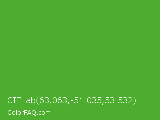 CIELab 63.063,-51.035,53.532 Color is a normal green color and the nearest color is Apple #4fa83d. Hex code #4dad2e and RGB value is rgb(77,173,46). In RGB color space, this color is composed of 30% red, 68% green, 18% blue, In CMYK color space, this color is composed of 55% cyan, 0% magenta, 73% yellow , 32% black , In HSL color space, this color has a hue angle of 105° , 58% saturation and 43% lightness.