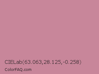 CIELab 63.063,28.125,-0.258 Color is a light rose color and the nearest color is Puce #cc8899. Hex code #c8869a and RGB value is rgb(200,134,154). In RGB color space, this color is composed of 78% red, 53% green, 60% blue, In CMYK color space, this color is composed of 0% cyan, 33% magenta, 23% yellow , 22% black , In HSL color space, this color has a hue angle of 342° , 38% saturation and 65% lightness.