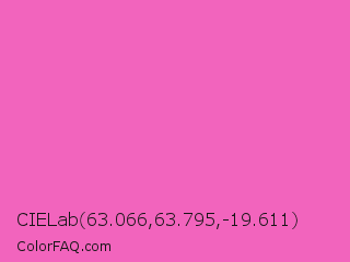 CIELab 63.066,63.795,-19.611 Color is a light magenta color and the nearest color is Hot Pink #ff69b4. Hex code #f264bd and RGB value is rgb(242,100,189). In RGB color space, this color is composed of 95% red, 39% green, 74% blue, In CMYK color space, this color is composed of 0% cyan, 59% magenta, 22% yellow , 5% black , In HSL color space, this color has a hue angle of 322° , 85% saturation and 67% lightness.