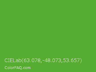 CIELab 63.078,-48.073,53.657 Color is a normal green color and the nearest color is Green RYB #66b032. Hex code #56ac2e and RGB value is rgb(86,172,46). In RGB color space, this color is composed of 34% red, 67% green, 18% blue, In CMYK color space, this color is composed of 50% cyan, 0% magenta, 73% yellow , 33% black , In HSL color space, this color has a hue angle of 101° , 58% saturation and 43% lightness.