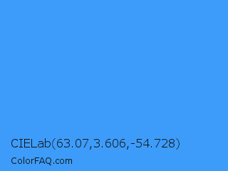 CIELab 63.07,3.606,-54.728 Color is a light blue color and the nearest color is Brilliant Azure #3399ff. Hex code #3d9cfa and RGB value is rgb(61,156,250). In RGB color space, this color is composed of 24% red, 61% green, 98% blue, In CMYK color space, this color is composed of 76% cyan, 38% magenta, 0% yellow , 2% black , In HSL color space, this color has a hue angle of 210° , 95% saturation and 61% lightness.