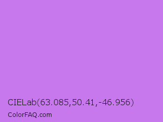 CIELab 63.085,50.41,-46.956 Color is a light purple color and the nearest color is Lavender #b57edc. Hex code #c778ed and RGB value is rgb(199,120,237). In RGB color space, this color is composed of 78% red, 47% green, 93% blue, In CMYK color space, this color is composed of 16% cyan, 49% magenta, 0% yellow , 7% black , In HSL color space, this color has a hue angle of 281° , 76% saturation and 70% lightness.