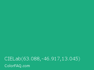 CIELab 63.088,-46.917,13.045 Color is a normal green color and the nearest color is Green Crayola #1cac78. Hex code #1cad80 and RGB value is rgb(28,173,128). In RGB color space, this color is composed of 11% red, 68% green, 50% blue, In CMYK color space, this color is composed of 84% cyan, 0% magenta, 26% yellow , 32% black , In HSL color space, this color has a hue angle of 161° , 72% saturation and 39% lightness.
