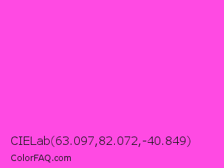 CIELab 63.097,82.072,-40.849 Color is a light magenta color and the nearest color is Purple Pizzazz #fe4eda. Hex code #ff4ae3 and RGB value is rgb(255,74,227). In RGB color space, this color is composed of 100% red, 29% green, 89% blue, In CMYK color space, this color is composed of 0% cyan, 71% magenta, 11% yellow , 0% black , In HSL color space, this color has a hue angle of 309° , 100% saturation and 65% lightness.