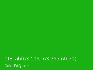 CIELab 63.103,-63.365,60.79 Color is a normal green color and the nearest color is Slimy Green #299617. Hex code #1ab113 and RGB value is rgb(26,177,19). In RGB color space, this color is composed of 10% red, 69% green, 7% blue, In CMYK color space, this color is composed of 85% cyan, 0% magenta, 89% yellow , 31% black , In HSL color space, this color has a hue angle of 117° , 81% saturation and 38% lightness.
