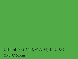 CIELab 63.113,-47.04,42.592 Color is a normal green color and the nearest color is Apple #4fa83d. Hex code #51ac48 and RGB value is rgb(81,172,72). In RGB color space, this color is composed of 32% red, 67% green, 28% blue, In CMYK color space, this color is composed of 53% cyan, 0% magenta, 58% yellow , 33% black , In HSL color space, this color has a hue angle of 115° , 41% saturation and 48% lightness.