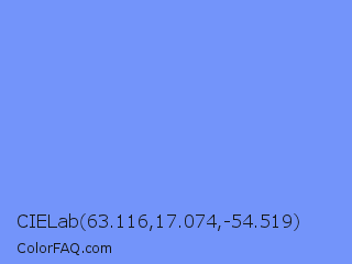 CIELab 63.116,17.074,-54.519 Color is a light blue color and the nearest color is Cornflower Blue #6495ed. Hex code #7394fa and RGB value is rgb(115,148,250). In RGB color space, this color is composed of 45% red, 58% green, 98% blue, In CMYK color space, this color is composed of 54% cyan, 41% magenta, 0% yellow , 2% black , In HSL color space, this color has a hue angle of 225° , 93% saturation and 72% lightness.