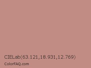 CIELab 63.121,18.931,12.769 Color is a light red color and the nearest color is Brandy Rose #bb8983. Hex code #c18c83 and RGB value is rgb(193,140,131). In RGB color space, this color is composed of 76% red, 55% green, 51% blue, In CMYK color space, this color is composed of 0% cyan, 27% magenta, 32% yellow , 24% black , In HSL color space, this color has a hue angle of 9° , 33% saturation and 64% lightness.