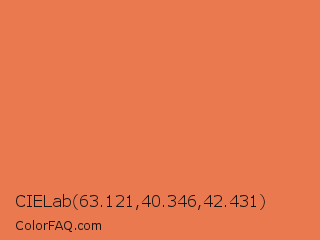 CIELab 63.121,40.346,42.431 Color is a light orange color and the nearest color is Burnt Sienna #e97451. Hex code #ea794f and RGB value is rgb(234,121,79). In RGB color space, this color is composed of 92% red, 47% green, 31% blue, In CMYK color space, this color is composed of 0% cyan, 48% magenta, 66% yellow , 8% black , In HSL color space, this color has a hue angle of 16° , 79% saturation and 61% lightness.