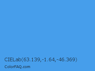 CIELab 63.139,-1.64,-46.369 Color is a normal blue color and the nearest color is Picton Blue #45b1e8. Hex code #469eeb and RGB value is rgb(70,158,235). In RGB color space, this color is composed of 27% red, 62% green, 92% blue, In CMYK color space, this color is composed of 70% cyan, 33% magenta, 0% yellow , 8% black , In HSL color space, this color has a hue angle of 208° , 80% saturation and 60% lightness.