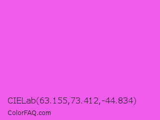 CIELab 63.155,73.412,-44.834 Color is a light magenta color and the nearest color is Purple Pizzazz #fe4eda. Hex code #ef5bea and RGB value is rgb(239,91,234). In RGB color space, this color is composed of 94% red, 36% green, 92% blue, In CMYK color space, this color is composed of 0% cyan, 62% magenta, 2% yellow , 6% black , In HSL color space, this color has a hue angle of 302° , 82% saturation and 65% lightness.