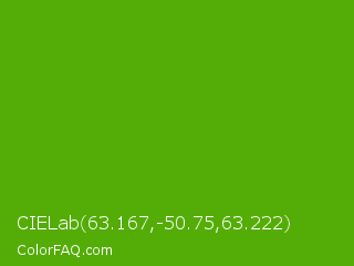 CIELab 63.167,-50.75,63.222 Color is a normal green color and the nearest color is Kelly Green #4cbb17. Hex code #54ad07 and RGB value is rgb(84,173,7). In RGB color space, this color is composed of 33% red, 68% green, 3% blue, In CMYK color space, this color is composed of 51% cyan, 0% magenta, 96% yellow , 32% black , In HSL color space, this color has a hue angle of 92° , 92% saturation and 35% lightness.
