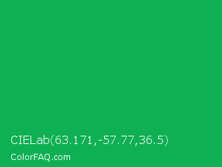 CIELab 63.171,-57.77,36.5 Color is a normal green color and the nearest color is Green Pigment #00a550. Hex code #0fb054 and RGB value is rgb(15,176,84). In RGB color space, this color is composed of 6% red, 69% green, 33% blue, In CMYK color space, this color is composed of 91% cyan, 0% magenta, 52% yellow , 31% black , In HSL color space, this color has a hue angle of 146° , 84% saturation and 37% lightness.